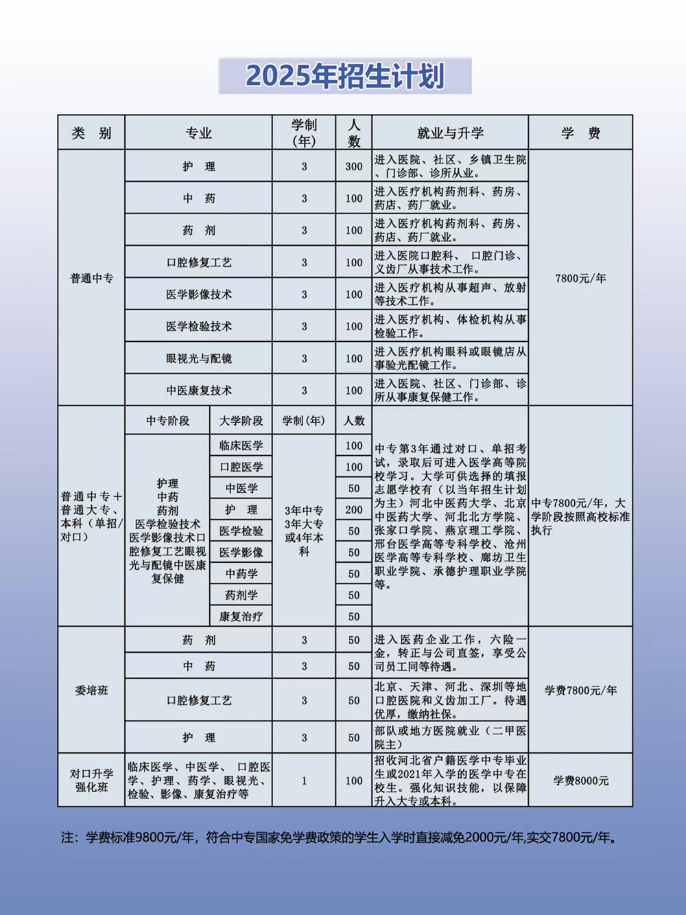 石家庄冀中医学中等专业学校招生专业有护理专业、药剂专业、中药专业、医学检验技术专业、医学影像技术专业、口腔修复工艺专业、眼视光与配镜专业、中医康复技术专业。