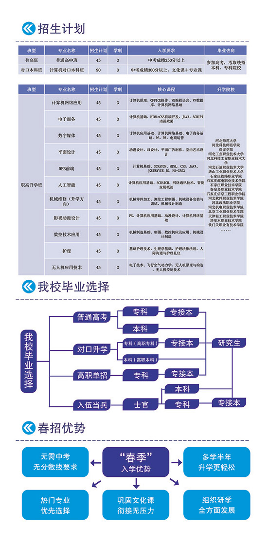 升学班:计算机应用,电子商务、数字媒体、平面设计、UI设计、 机械专业,数控技术应用、WEB前端、护理、人工智能、无人机应用技术